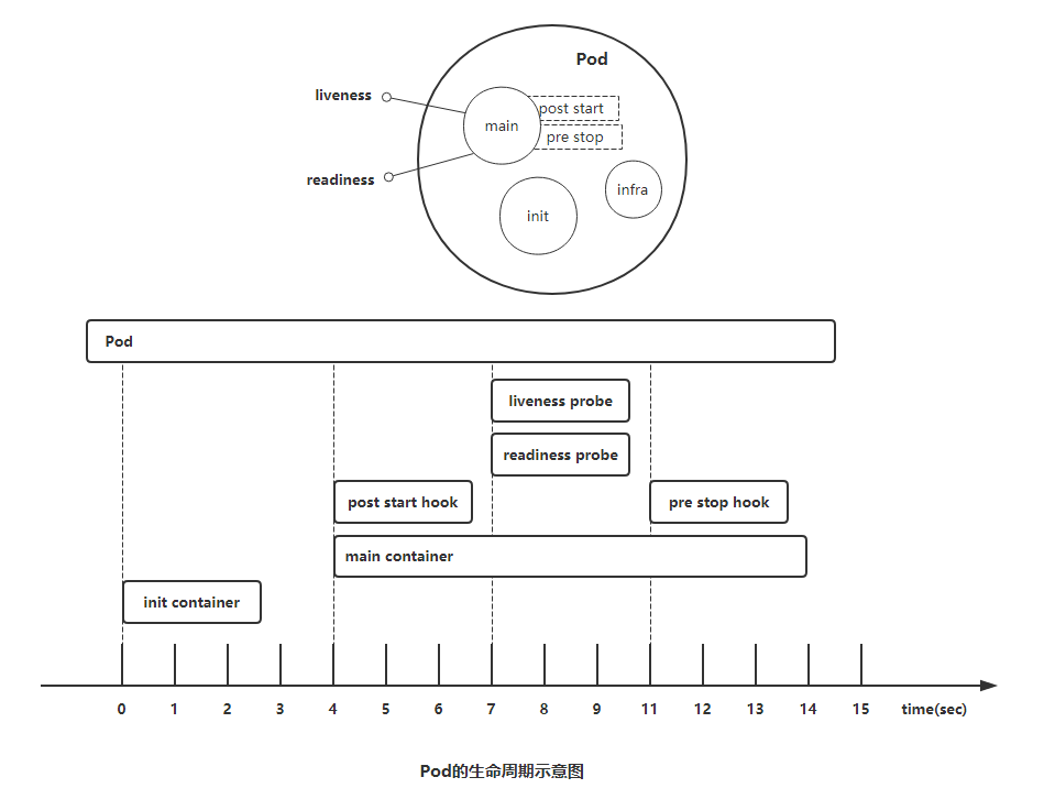 Pod对象自从其创建开始至其终止退出的时间范围称为其生命周期。在这段时间中,Pod会处于多种不同的状态,并执行一些操作;其中,创建主容器(main container)为必需的操作,其他可选的操作还包括运行初始化容器(init container)、容器启动后钩子(post start hook)、容器的存活性探测(liveness probe)、就绪性探测(readiness probe)以及容器终止前钩子(pre stop hook)等,这些操作是否执行则取决于Pod的定义。如下图所示: