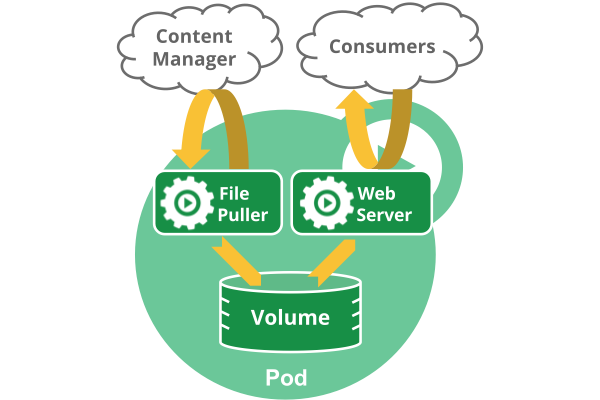 Pod中同时运行多个容器是一种比较高级的用法。只有当你的容器需要紧密配合协作的时候才考虑用这种模式。例如,你有一个容器作为web服务器运行,需要用到共享的volume,有另一个“sidecar”容器来从远端获取资源更新这些文件,如下图所示:
