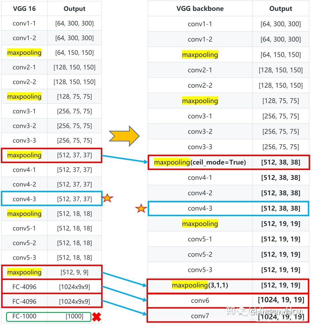 可以看到原始的SSD网络是以VGG-16作Backbone(骨干网络)的。为了更加清晰看到相比于VGG16,SSD的网络使用了哪些变化,知乎上的一个帖子做了一个非常清晰的图,这里借用一下,原图地址为:https://zhuanlan.zhihu.com/p/79854543 。带有特征图维度信息的更清晰的骨干网络和VGG16的对比图如下: