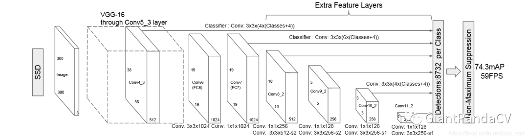 为了比较好的对应SSD的结构来看代码,我们首先放出SSD的网络结构,如下图所示: