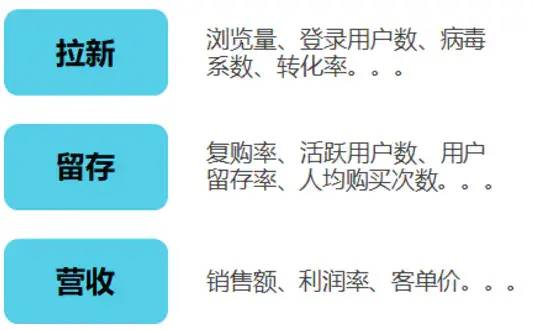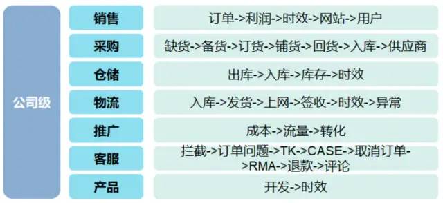 在销售额这个第一关键指标的指导下,需要关注的不只是用户转化、留存率的情况,还需要关注采购、仓储、物流等各个环节的成本、时效等,因此将指标模块划分如下: