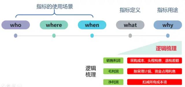 解决指标的逻辑问题,明确指标与指标之间的逻辑关系,如:销售利润=销售额-采购成本-头程税费-退税差额,毛利润=销售利润-呆滞计提-资金占用利息:
