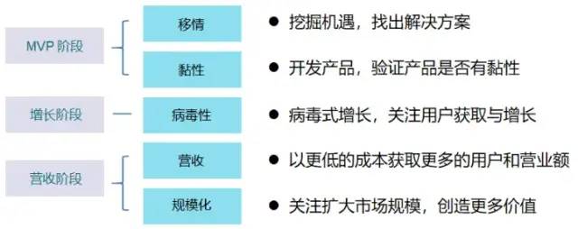 第一关键指标法的核心思想,不是说一个公司只为一个指标负责,而是说在任意一个时间点,肯定只有一个最关键的指标,但随着业务的发展关注重点会有变化。所处商业模式一般有电子商务、SaaS、移动APP、双边市场、媒体、UCG等,所处阶段从大的阶段可以分为MVP、增长、营收三个阶段,往细了分又可以再拆分为5个阶段,每个阶段的指标体系需要解决的问题都有差异: