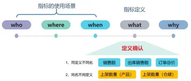 解决指标的计算口径问题,大多数情况下需要解决的是同名不同义、同义不同名的问题,如下图的销售额、上架数量两个指标所示: