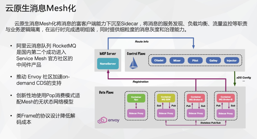 目前阿里云消息队列 RocketMQ 是国内第二个成功进入 Service Mesh 官方社区的中间件产品,在进行 Envoy 适配的过程中推动了Envoy社区加速对 on-demand CDS 的支持,创新性地使用 Pop 消费模式来适配 Mesh 的无状态网络模型。