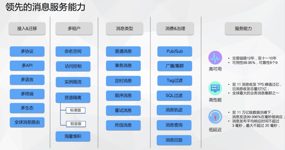 高性能:双 11 消息收发 TPS 峰值过亿,日消息收发总量 3 万亿;拥有全球最大的业务消息集群之一。