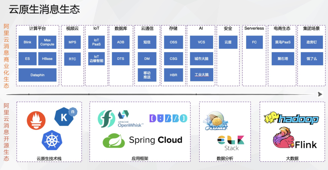 在开源方面,开源 RocketMQ 已经完成了云原生技术栈的集成,包括Knative中的事件源,Prometheus 的 Exporter,K8s 的 Operator等;也支持了微服务框架 Dubbo、SpringCloud 以及函数计算框架 OpenWhisk ;同时开发了很多 Connector 作为 Sink 或者 Source 去连接了 ELK、Flume、Flink、Hadoop 等大数据和数据分析领域的优秀开源产品。