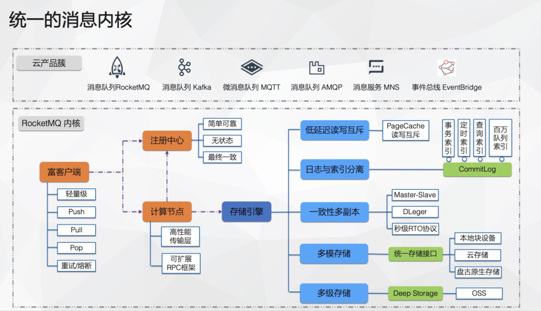 阿里云消息队列的另一核心竞争力为统一的消息内核,整个消息云产品簇都建设在统一的 RocketMQ 内核之上,所有的云产品提供一致的底层能力。