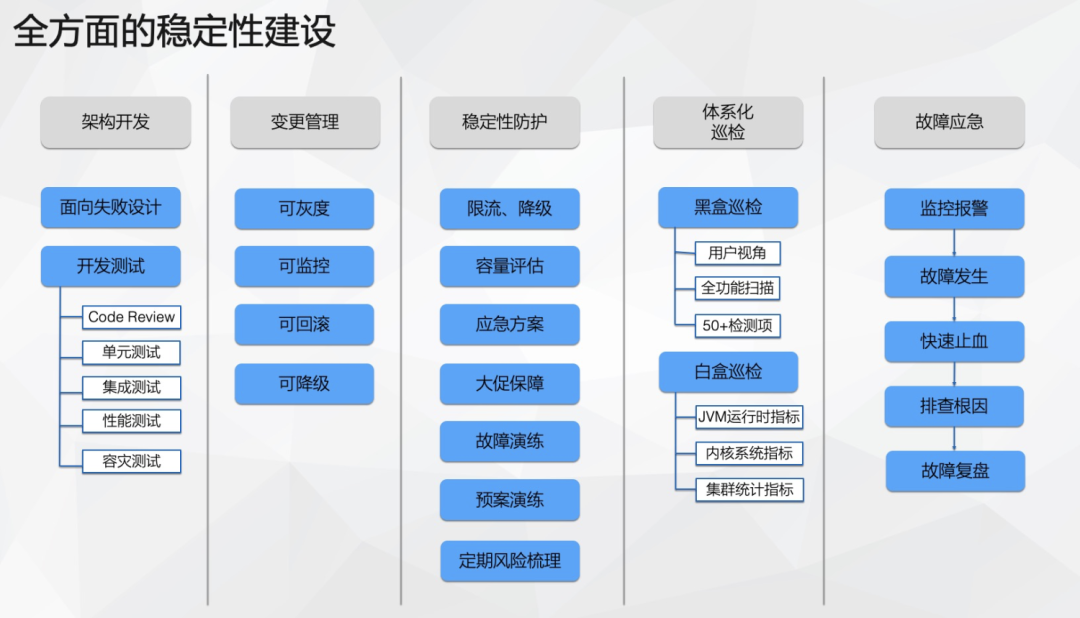 限流、降级、容量评估、应急方案、大促保障、故障演练、预案演练、定期风险梳理等都是我们的稳定性防护手段。