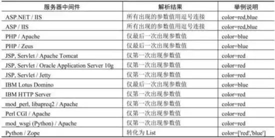 HTTP参数污染是指当同一参数出现多次,不同的中间件会解析为不同的结果,具体如表所示(例子以参数color=red&color= blue为例)