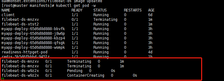 通过修改containers的image镜像来测试滚动更新 ,先删除一个pod,再新建一个,滚动式更新。一次滚动几个根据maxUnavailable的值是多大(kubectl explain ds.spec.updateStrategy.rollingUpdate)