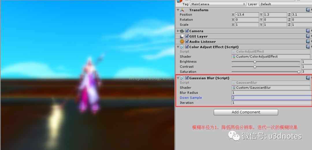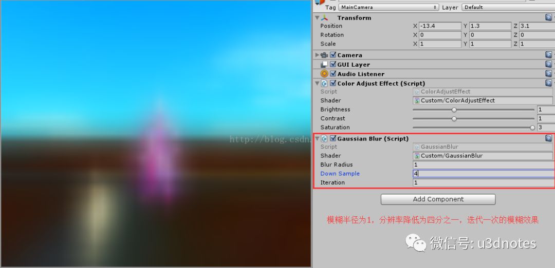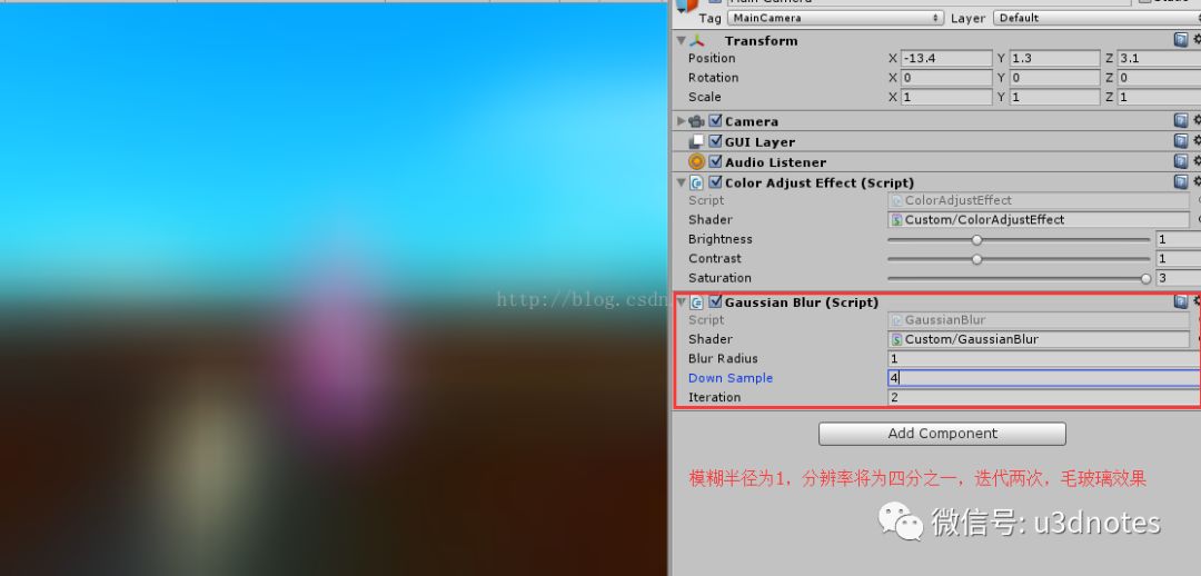 我们在MainCamera上挂在GaussianBlur脚本,然后把GaussianBlur.shader赋给shader槽,就可以看到模糊的效果了。