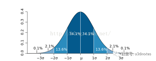 其中μ是正态分布随机变量的均值,也就是期望值,也就是下图中x轴上最中间的位置,随机变量在μ两侧对称分布,而第二个参数σ^2是这个随机变量的方差,因而正态分布记为N(μ,σ2 ),符合正态分布的随机变量越靠近μ则概率越大,而越远离μ概率越小,σ越小,分布越集中在μ附近,σ越大,分布越分散。而当μ=0,σ^2=1时,称为标准正态分布,记为N(0,1)。正态分布的图像如下图所示: