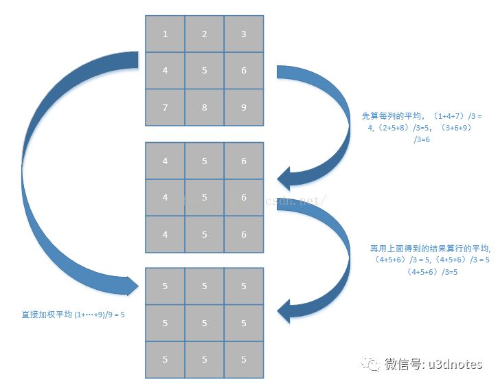 从上面的图中我们看出,直接计算整个的平均数,和先计算横向的平均,再计算竖向的平均,得到的结果是相同的,也就是说两者是等价的(注意,本图只是一个类比,并不代表高斯模糊的原理,证明线性系统可以拆分成多个独立的操作,或者哪位高人有更好的证明方式也可以指点小弟一下)。