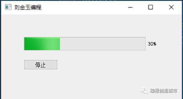 import sysfrom PyQt5.QtWidgets import QApplication,QWidget,QPushButton,QProgressBarfrom PyQt5.QtCore import QBasicTimerclass MyClass(QWidget):def __init__(self):super(MyClass, self).__init__()self.initUI()def initUI(self):self.setWindowTitle("刘金玉编程")self.setGeometry(300,100,400,300)#载入进度条控件self.pgb=QProgressBar(self)self.pgb.move(50,50)self.pgb.resize(300,20)#配置一个值表示进度条的当前进度self.pv=0#申明一个时钟控件self.timer1=QBasicTimer()#设置进度条的范围self.pgb.setMinimum(0)self.pgb.setMaximum(100)self.pgb.setValue(self.pv)#载入按钮self.btn=QPushButton("开始",self)self.btn.move(50,100)self.btn.clicked.connect(self.myTimerState)self.show()def myTimerState(self):if self.timer1.isActive():self.timer1.stop()self.btn.setText("开始")else:self.timer1.start(100, self)self.btn.setText("停止")def timerEvent(self,e):if self.pv==100:self.timer1.stop()self.btn.setText("完成")else:self.pv+=1self.pgb.setValue(self.pv)if __name__=="__main__":app=QApplication(sys.argv)mc=MyClass()app.exec_()
