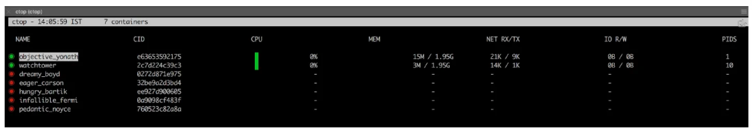 ctop 是一个简单的工具,对于了解在你的主机上运行的容器很有帮助。你可以在 ctop 文档中了解更多相关信息: