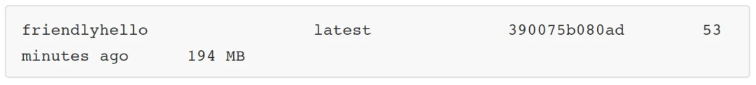 为举例需要,我参考 Docker 官方文档创建了一个名为 friendlyhello 的 Docker 镜像,该镜像大小为 194MB(如下所示):