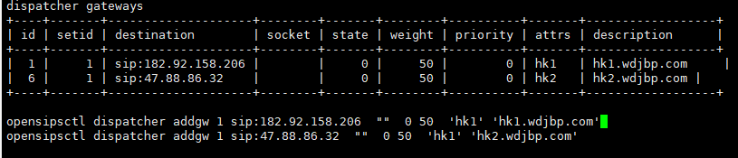 opensipsctl dispatcher addgw 1 sip:47.88.86.32 "" 0 50 'hk1' 'hk2.wdjbp.com'
