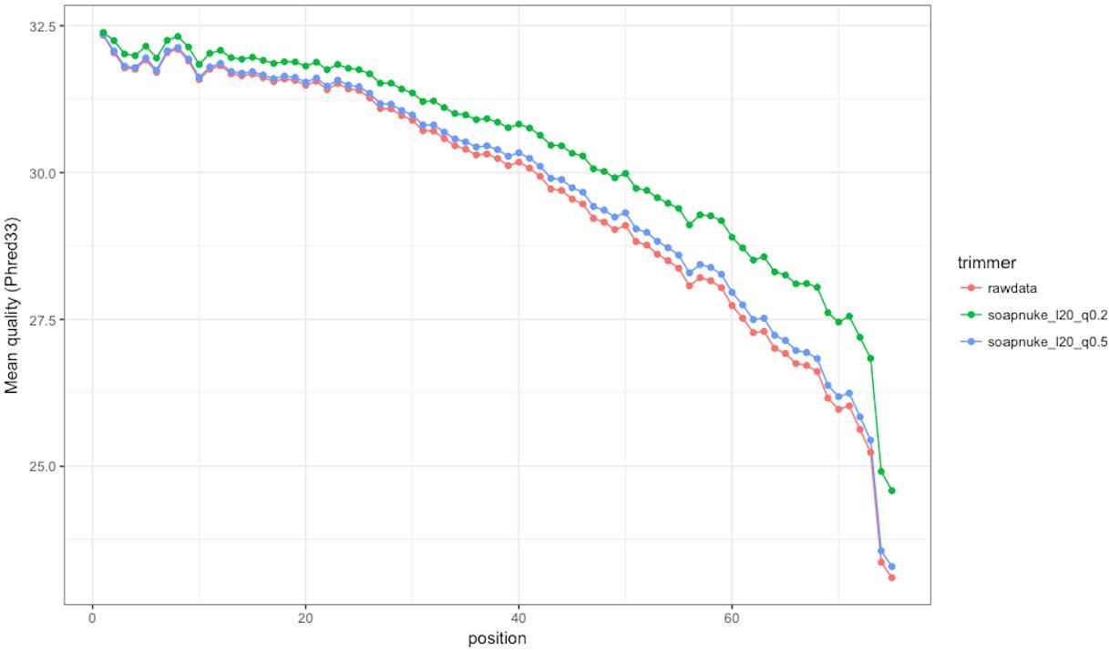 这个图3中,我把SOAPnuke中低质量碱基占比的参数调得更加严格(20%)再和默认的50%相比,但发现改善并不特别明显。原因在于SOAPnuke并不切除read的末端低质量序列,而只是通过判断当read中低质量的碱基比例达到一定程度的时候整个read去除。但这种情况其实是不合理的,因为根据目前的测序原理,read的错误率会明显富集于末端区域,而前半部分的质量都会比较高,这种计算比例的方法并不能很好地反映这一现象。虽然我们可以通过设置更严格的参数,比如图3将低质量值碱基的占比从50%降为20%来改善,lowQual也可以设置得更高一些,来获得一些改善。但我想说的是,这种差别的根本原因源自于对末端低质量碱基序列的处理,SOAPnuke这种整体性统计的方法,并不能有针对性地处理这些碱基。在实际的操作要花更多的时间和精力对参数进行对比(影响最大的参数是-q低质量碱基占比),这不是一个高明的手段,远不如其他三个通过滑动窗口计算局部质量值的方式来得直接和灵敏。