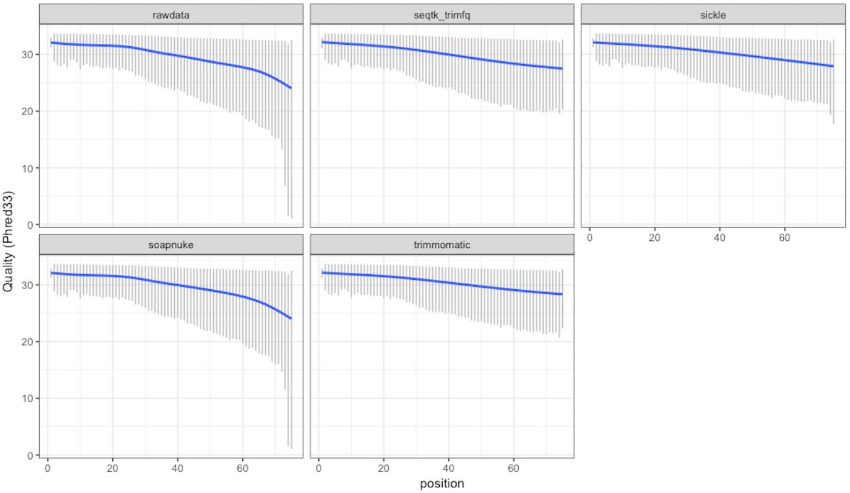 毫无疑问,从上面的比较结果中,我们可以明显发现,Trimmomatic最优,sickle次之,seqtk第三。当然,这其中结果最好的Trimmomatic丢弃掉的数据要比其他的略多(约1%~2%)。这三种里面比较特殊的是seqtk,它不丢弃任何read,只是将其截短,而且如果长度低于设定的最低read长度就不切除了,直接保留原数据。这也是为什么它相比于Trimmomatic和sickle而言质量要差的重要原因,可即便如此它们的结果其实相差并不多。反观SOAPnuke,不得不说SOAPnuke的过滤效果是最差的,几乎没什么效果。
