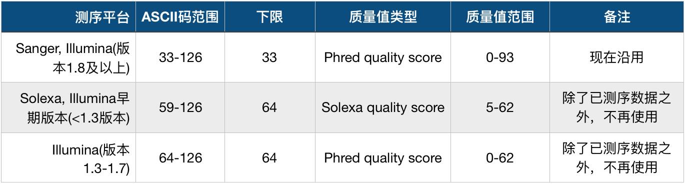 第四行:测序read的质量值,这个和第二行的碱基信息一样重要,它描述的是每个测序碱基的可靠程度,用ASCII码表示。