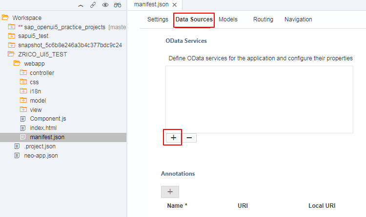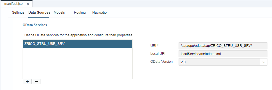 文件保存后退出,然后重启WEB IDE平台,打开manifest.json配置数据源,进入Data Sources页面,增加Odata services
