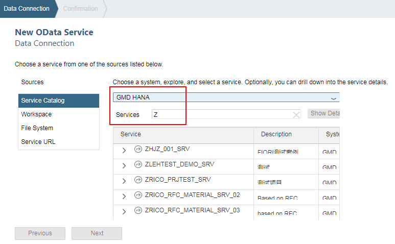 Services输入前缀字符Z,下面目录会自动带出SAP后台已创建的OData服务