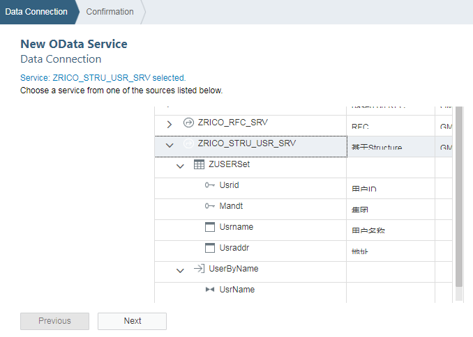 选择对应的服务,可以看到服务下面的实体集合以及对应的字段名,例如:服务ZRICO_STRU_USR_SRV集合ZUSERSet,然后继续Next