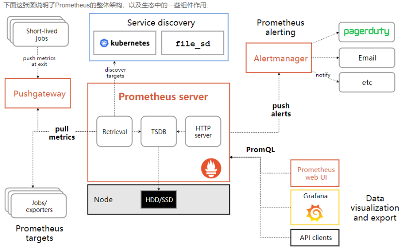 如上图,每个被监控的主机都可以通过专用的exporter程序提供输出监控数据的接口,并等待Prometheus服务器周期性的进行数据抓取。如果存在告警规则,则抓取到数据之后会根据规则进行计算,满足告警条件则会生成告警,并发送到Alertmanager完成告警的汇总和分发。当被监控的目标有主动推送数据的需求时,可以以Pushgateway组件进行接收并临时存储数据,然后等待Prometheus服务器完成数据的采集。