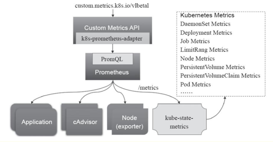 node-exporter: prometheus的export,收集Node级别的监控数据prometheus: 监控服务端,从node-exporter拉数据并存储为时序数据。kube-state-metrics: 将prometheus中可以用PromQL查询到的指标数据转换成k8s对应的数据k8s-prometheus-adpater: 聚合进apiserver,即一种custom-metrics-apiserver实现开启Kubernetes aggregator功能(参考上文metric-server)