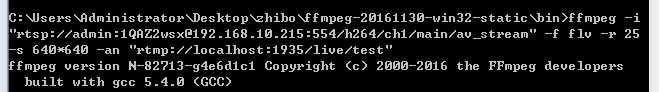 ffmpeg -i "rtsp://admin:ajb123456@192.168.10.36" -f flv -r 25 -s 640*640 -an "rtmp://localhost:1935/live/test"