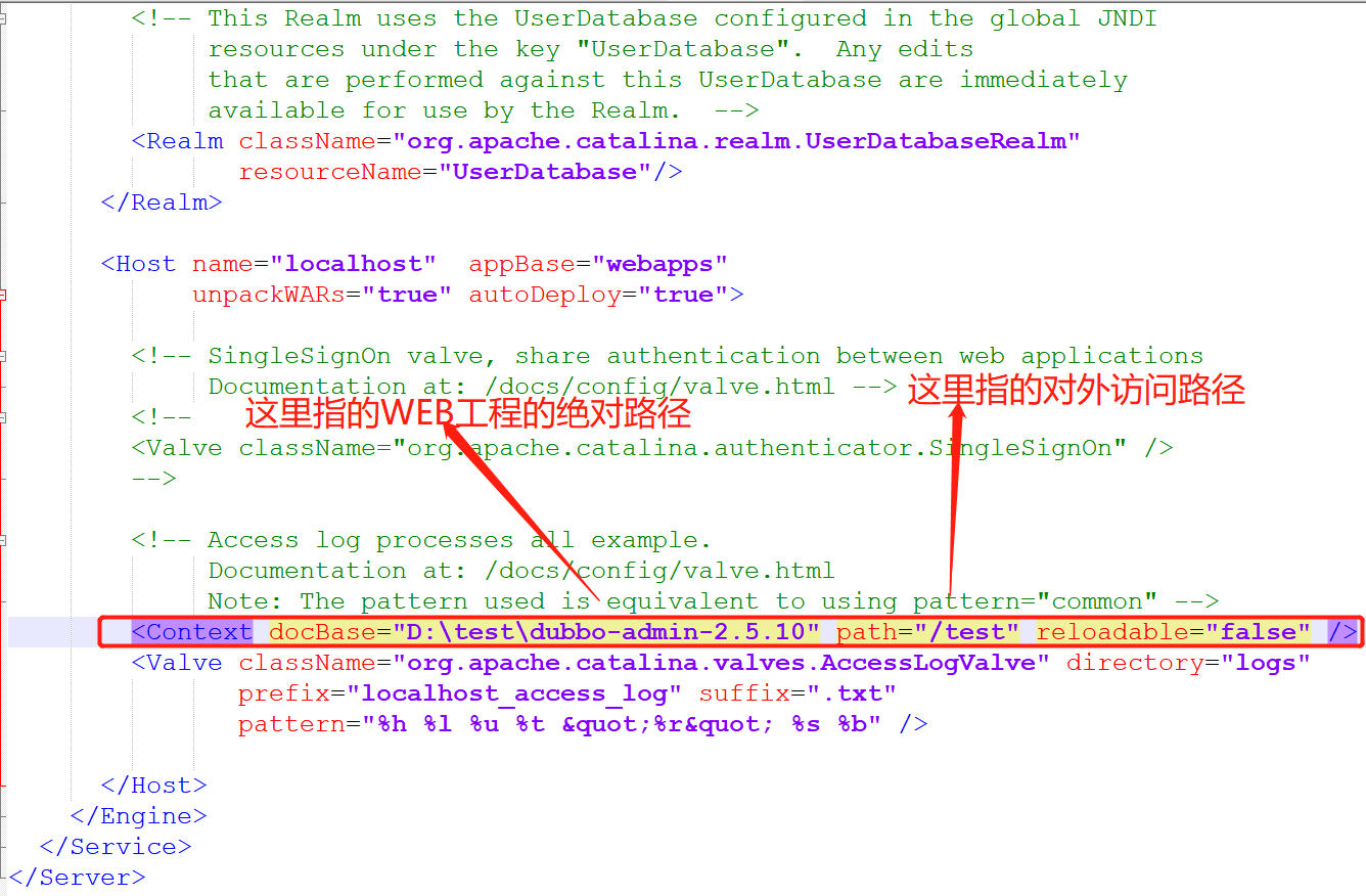 添加如下:<Context docBase="D:\test\dubbo-admin-2.5.10" path="/test" reloadable="false" />(访问路径为path内容)