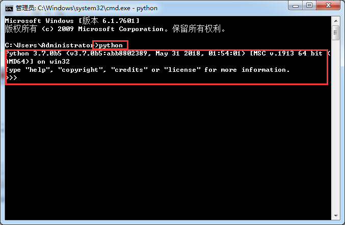 在cmd 命令栏里面 输入 python 回车,出现》》》 说明环境变量已经配置好。