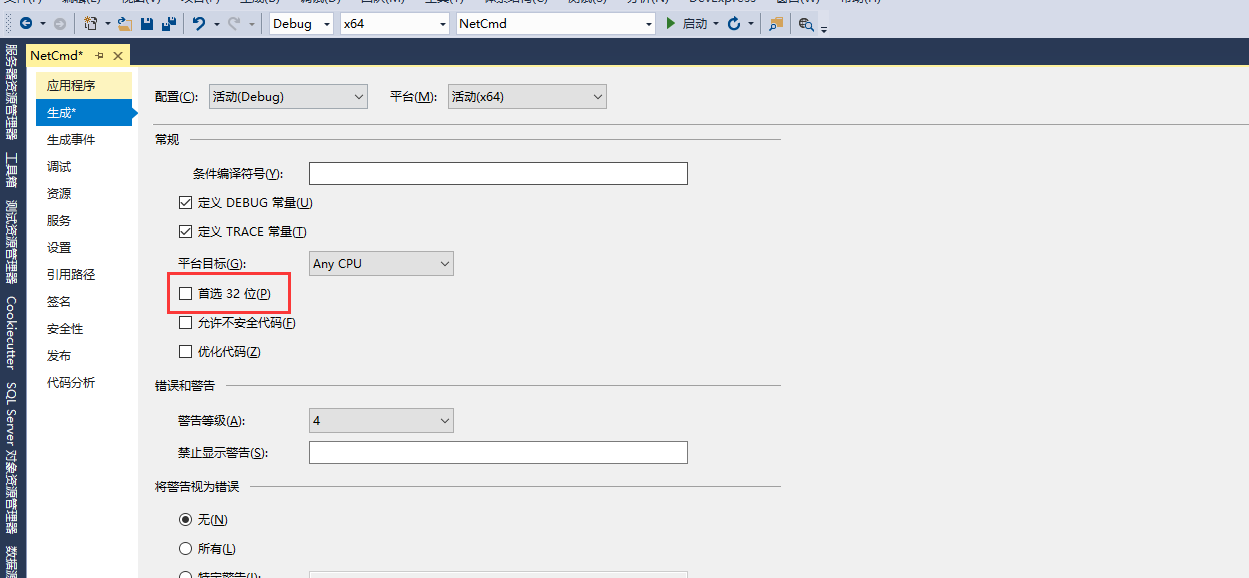 VS默认不启用32位可以修改项目设置,将首选32取消选择就可以默认64位启动了