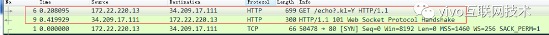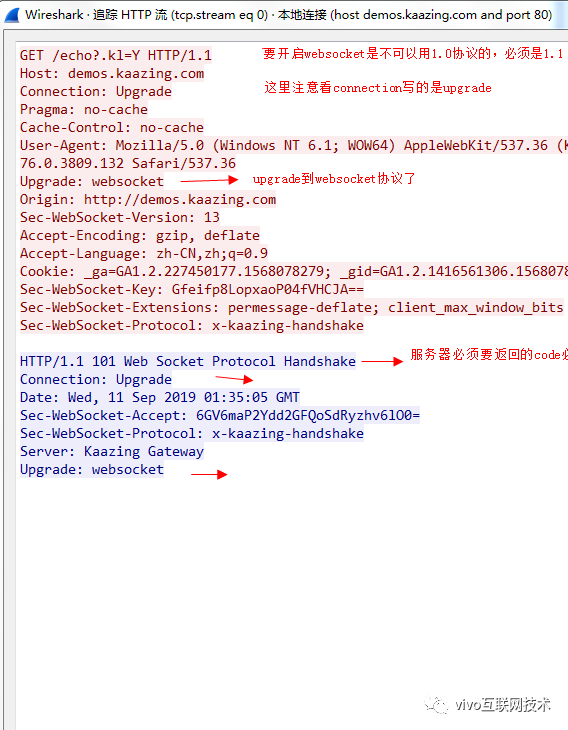 这个抓包结果显示的说明了WebSocket下面使用的tcp连接是交给HTTP1.1来发起的。来详细看一下,这里我用箭头标注的都是必须要设置的HTTP头部信息,否则是无法完成WebSocket连接的建立的。