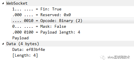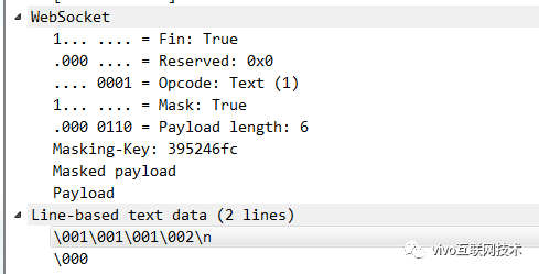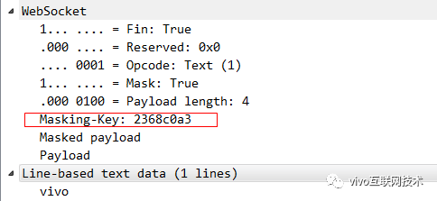 当我们的服务器接收到这个WebSocket帧以后就可以用这个mask-key来反异或,从而就可以得出真正的内容了,这是最低成本实现检测WebSocket帧是否遭到篡改的方案。例如:我们用WebSocket 传输一个 文本帧,内容为字符串vivo,vivo的ascii码的16进制为:76 69 76 6f。而这个消息,这次浏览器生成的mask-key 为 23 68 c0 a3。