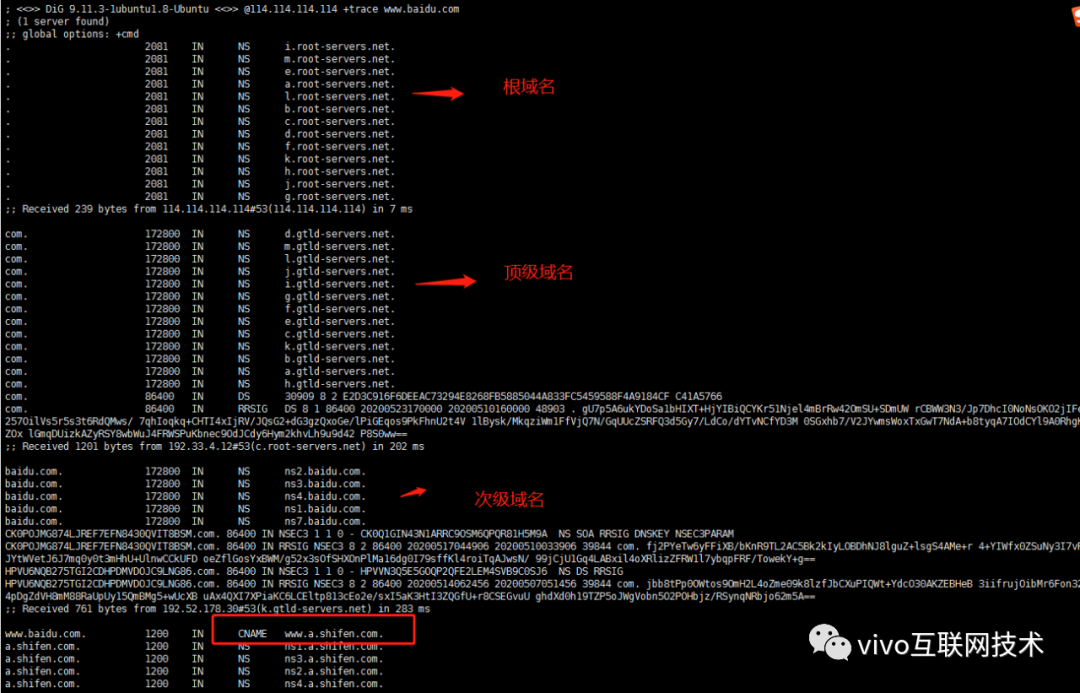 我们可以利用dig+trace命令来完整的还原一次分级查询的过程: