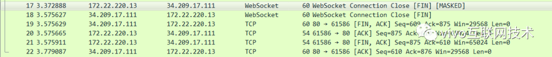 可以看出来,断开连接的步骤是客户端先发了一个断开连接的帧,然后服务端再给客户端发一个确认断开WebSocket连接的帧。最后就是tcp的四次挥手了,保证了tcp连接的彻底断开。