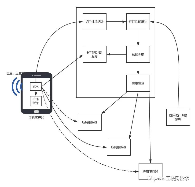 这种技术的原理其实挺简单的,无非就是让我们的手机App 发起一个HTTP请求(这个请求地址多数使用ip直连,如果使用域名那么依然针对此请求依然有传统DNS的问题),这个请求可以携带用户所在的运营商,地理位置,精确到省市,然后服务器根据这些信息 返回一个最佳的ip地址给App,然后App将这个域名-ip的映射关系设置到我们的okhttp中。这样手机中的大部分请求就会直接使用我们HTTP服务器返回的ip地址而不是运营商的地址了。