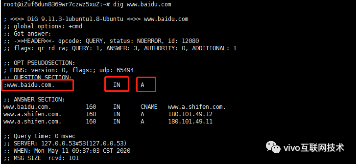 我们首先通过 Linux 下的dig命令来了解一下 DNS 是怎么做域名解析的。我们首先输入命令: