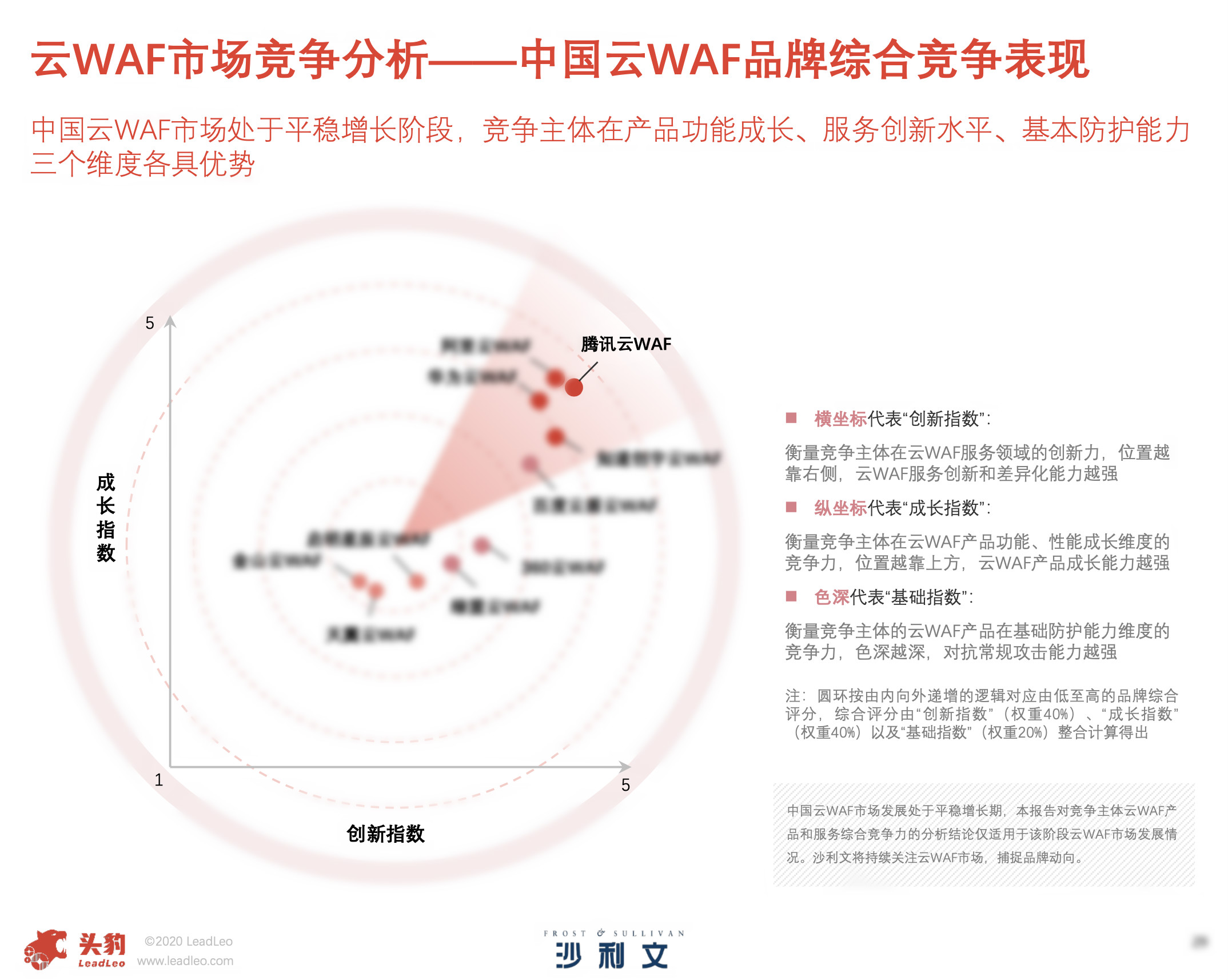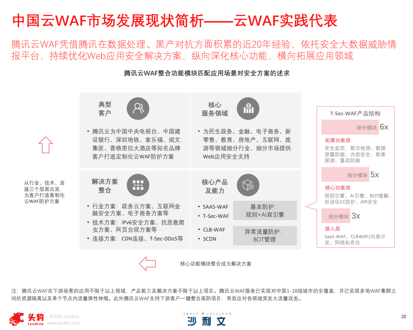 上云步伐的加快,使得企业对云端Web应用安全防护的需求由附加项转为“关键信息基础设施”,并带来了新的应用命题。8月18日,中国领先的行业和市场大数据库头豹研究院联合全球著名增长咨询公司沙利文发布了《2020年中国云WAF市场报告》(以下简称《报告》),聚焦中国云WAF市场现状、价值、发展趋势以及品牌竞争表现等方面的分析与评估。腾讯云WAF入选为中国云WAF安全市场实践代表,并在产品功能成长、服务创新水平、基本防护等维度的评比中全面保持领先,是综合表现最优异的厂商之一。