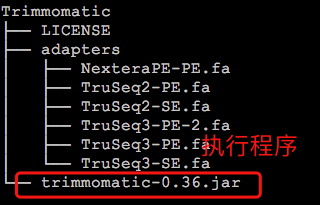 同个目录下还有一个名为adapters的文件夹,这个文件夹中的内容对于我们去除接头序列来说非常重要。其中默认存放的是illumina测序平台的接头序列(fasta格式),在实际的使用过程中,如果需要去除接头,我们需要明确指定对应的序列作为输入参数。