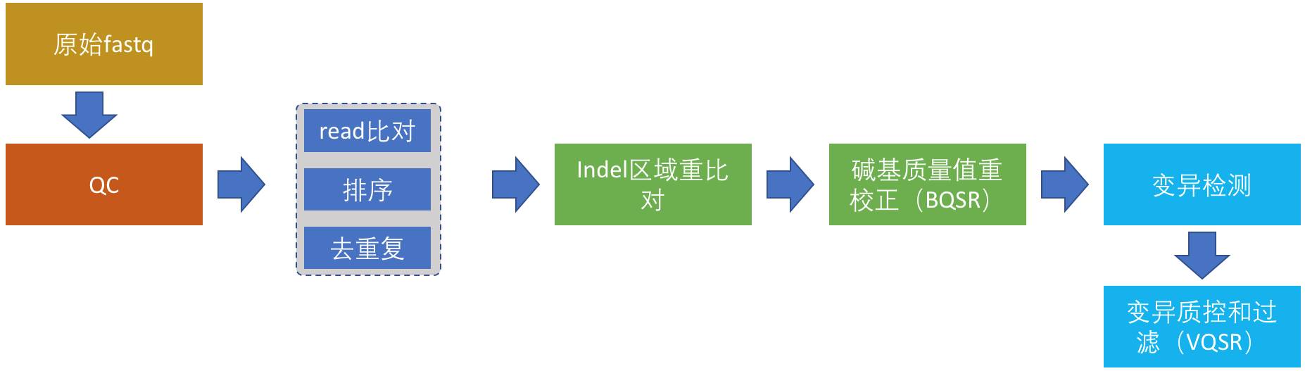 从这一节开始详细讲述正式流程的搭建,我将结合具体的例子努力争取将这个系列写成比GATK最佳实践更加具体、更具有实践价值的入门指南。整个完整的流程分为以下6部分: