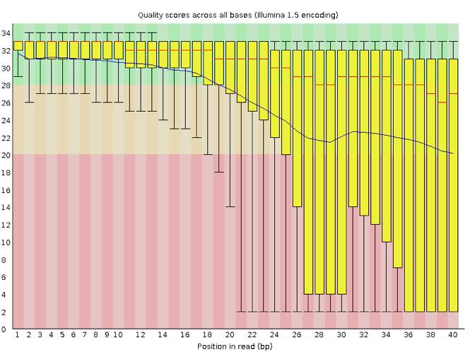 在这个图中我们可以明显看到,read各个位置上的碱基质量分布波动都比较大,特别从第18个碱基往后全部出现了大幅度的波动,而且很多read的碱基质量值都掉到非常低(红色)的区域中了,说明这个数据的测序结果真的非常差,有着大量不及格的read。最好的情况是重新测序,但如果不得不使用这个数据,就要把这些低质量的数据全都去除掉才行,同时还需留意是否还存在其他的问题,但不管如何都一定会丢掉很大一部分的数据。