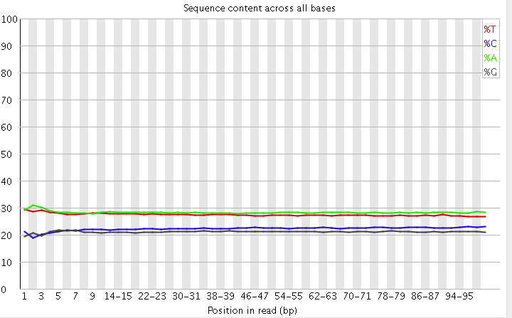 这个是为了分析碱基的分离程度。何为碱基分离?我们知道AT配对,CG配对,假如测序过程是比较随机的话(随机意味着好),那么在每个位置上A和T比例应该差不多,C和G的比例也应该差不多,如上图所示,两者之间即使有偏差也不应该太大,最好平均在1%以内,如果过高,除非有合理的原因,比如某些特定的捕获测序所致。