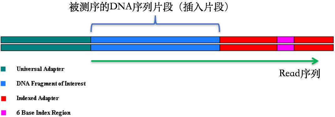 在第1节 测序技术里面我们提到了在测序之前需要构建测序文库,测序接头就是在这个时候加上的,其目的一方面是为了能够结合到flowcell上,另一方面是当有多个样本同时测序的时候能够利用接头信息进行区分。当测序read的长度大于被测序的DNA片段【注】时,就会在read的末尾测到这些接头序列(如下图)。一般的WGS测序是不会测到这些接头序列的,因为构建WGS测序的文库序列(插入片段)都比较长,约几百bp,而read的测序长度都在100bp-150bp这个范围。不过在进行一些RNA测序的时候,由于它们的序列本来就比较短很多只有几十bp长(特别是miRNA),那么就很容易会出现read测通的现象,这个时候就会在read的末尾测到这些接头序列。