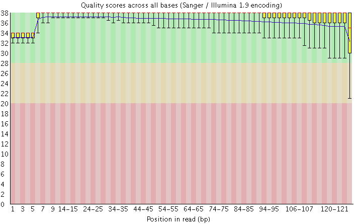 这个图的横轴是read上碱基的位置,纵轴是碱基质量值。在这个例子中,read的长度是126bp(来自HiSeq X10的测序结果),这应该算是比较长的二代测序序列了。我们可以看到read上的每一个位置都有一个黄色的箱型图表示在该位置上所有碱基的质量分布情况。除了最后一个碱基之外,其他的碱基质量值都基本都在大于30,而且波动很小,说明质量很稳定,这其实是一个非常高质量的结果。而且我们可以看到图中质量值的分布都在绿色背景(代表高质量)的区域。