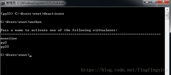 workon查看,这里的py3是python2版本的环境,py33是python3版本的环境