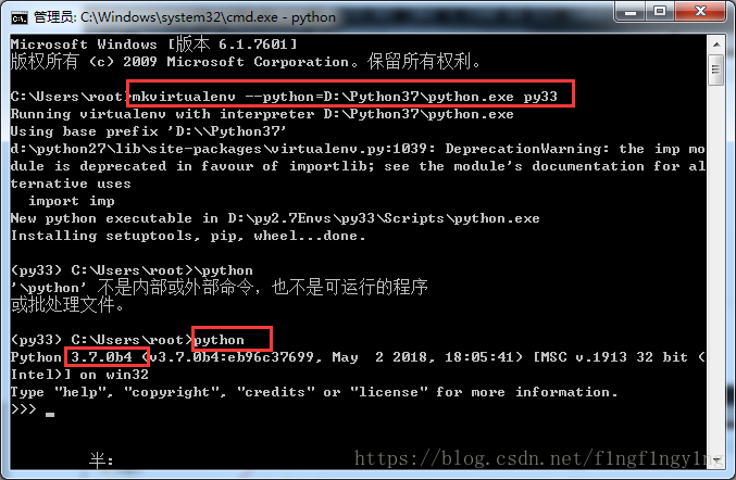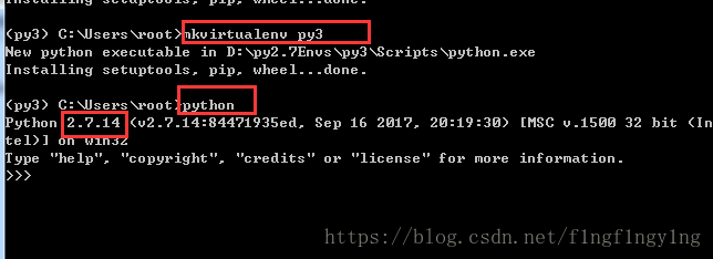 mkvirtualenv命令创建虚拟环境,这里默认先启动python2,和环境变量配置相关