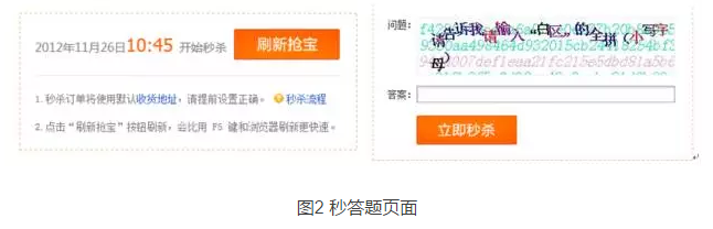 熟悉淘宝秒杀的都知道,第一版的秒杀系统本身并没有答题功能,后面才增加了秒杀答题,当然秒杀答题一个很重要的目的是为了防止秒杀器,2011年秒杀非常火的时候,秒杀器也比较猖獗,而没有达到全民参与和营销的目的,所以增加的答题来限制秒杀器。增加答题后,下单的时间基本控制在2s后,秒杀器的下单比例也下降到5%以下。新的答题页面如图2。